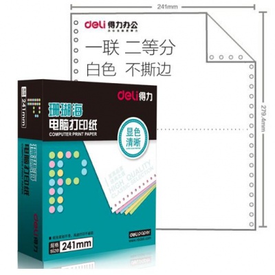 • 商品名称:得力(deli)珊瑚海白色电脑打印纸S241-1-1/2一联二等分二等分整张不撕边80列 (色序:全白 1000页/箱)